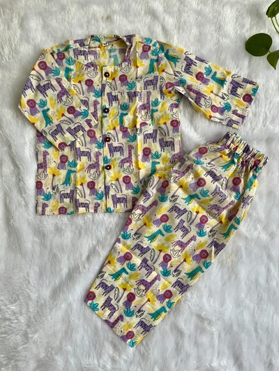 Soft, breathable cotton pajama set designed for all-day comfort. Features a relaxed fit with an elastic waistband, perfect for both boys and girls. Ideal for sleepwear and lounging. Gentle on skin and easy to maintain.