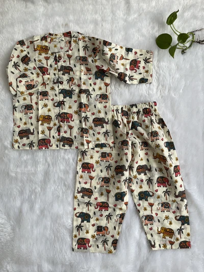 Soft, breathable cotton pajama set designed for all-day comfort. Features a relaxed fit with an elastic waistband, perfect for both boys and girls. Ideal for sleepwear and lounging. Gentle on skin and easy to maintain.