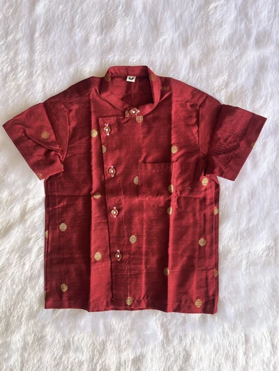 Made from rich dupion fabric, this shirt features elegant coin butta detailing for a classic festive look. Comfortable yet refined, it’s perfect for special occasions and traditional celebrations.